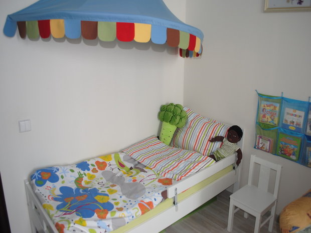 Комплекты детского постельного белья — тоже «ИКЕА». Они красочные, 100% хлопок, очень практичные в использовании. Покрывало — красивой расцветки, оригинального пошива, двустороннее. Можно использовать как одеяло. Еще купили подушку в виде брокколи — она мягкая, веселая и очень удобная.