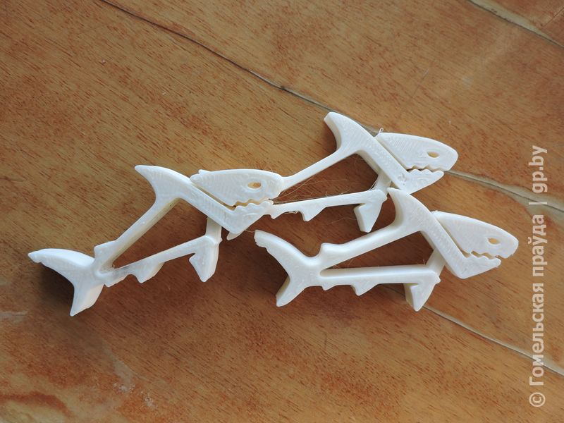 Сегодня домашние 3D-принтеры стоят от 300 до 3000 долларов, килограмм пластика — от 20 до 50, расходуется это количество у обычного пользователя примерно за месяц. Для примера, одна прищепка-акула — это 15 граммов, браслет — 8, печатаются около 10 минут.