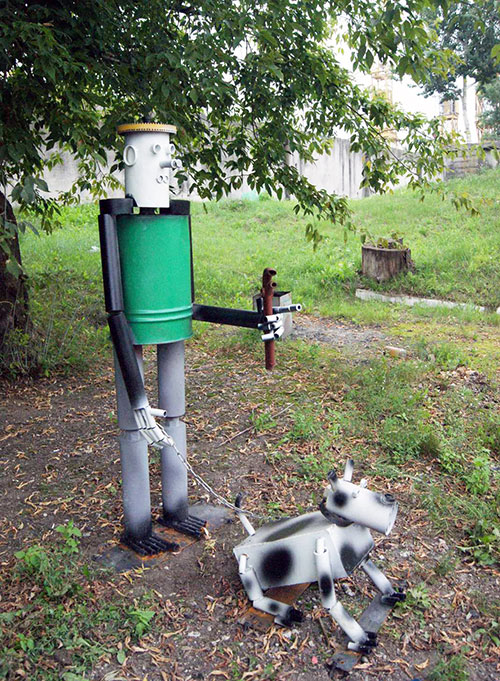 Принадлежность к профессии получившегося человечка подчеркнули инструментом, вложенным ему в руки. Ну а собачку сделали просто так, чтобы «не скучно было специалисту». Материалом для группы послужили отходы металла.