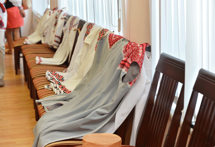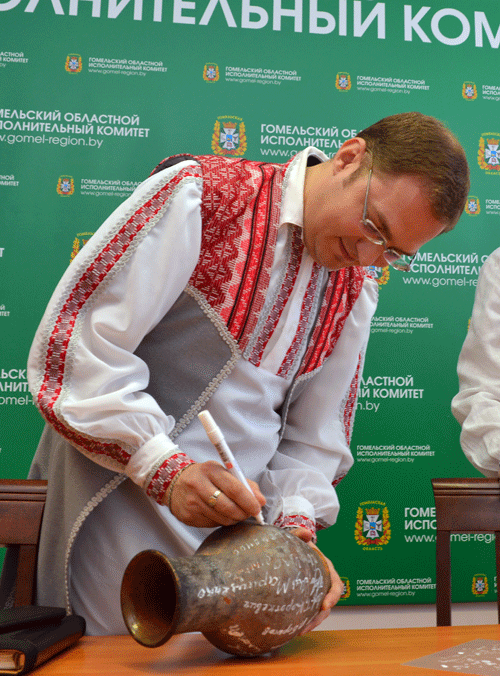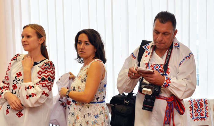 На брифинге журналистам предложили примерить вышиванки и расписаться на жбане.