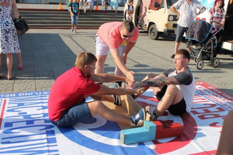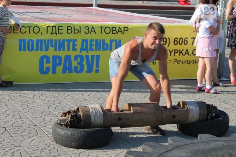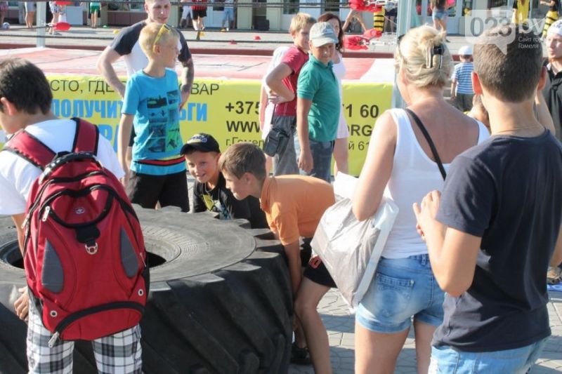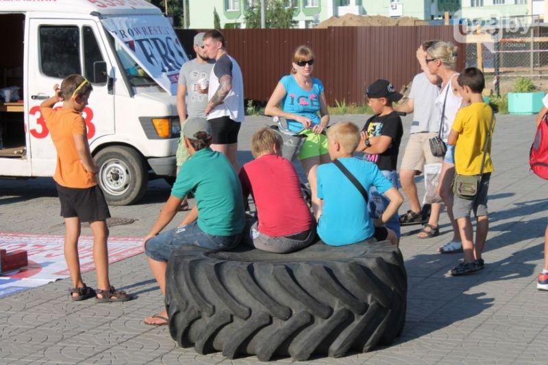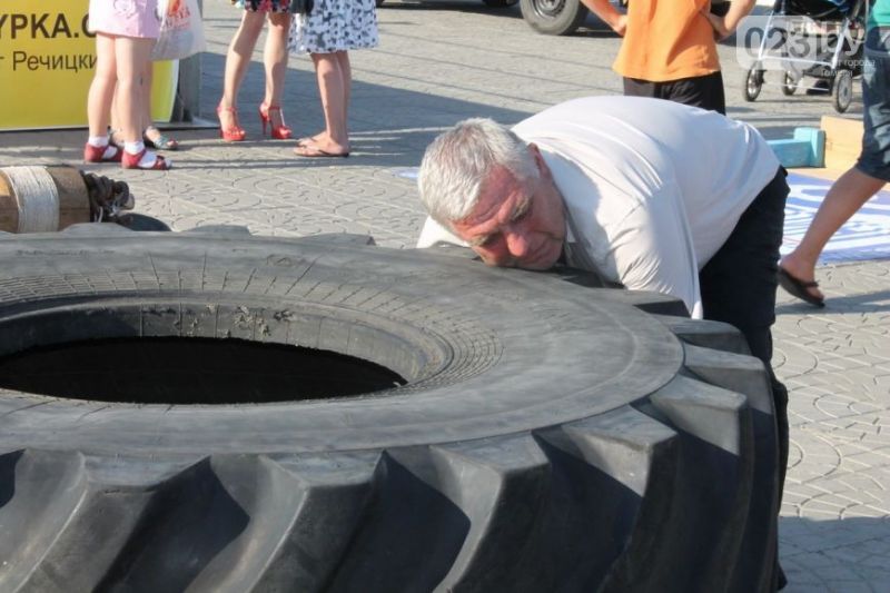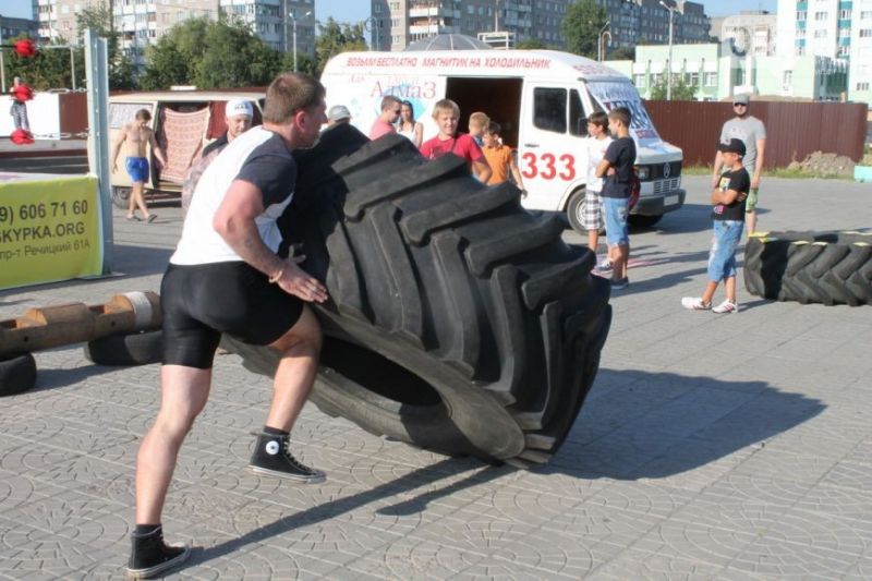 Мероприятие состояло из двух частей. Принять участие в первой мог любой желающий. Требовалось оторвать от земли и поставить вертикально резиновую шину от колеса легенды отечественного автопрома — самосвала БелАЗ. Вес покрышки — 320 килограммов.