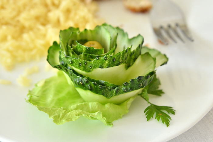 На первое Егору подали красный борщ. На второе — румяную куриную котлету с гарниром в виде ароматного риса басмати и малахитовым украшением из огуречного цветка.
