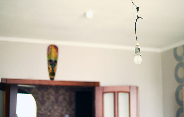 Ремонт завершён, лишь на потолке вместо люстры, как и полагается квартире новосёлов, — голая лампочка. Планировка незатейлива: на 55 квадратных метрах разместились зал, коридор, налево — кухня и санузел, направо — спальня.
