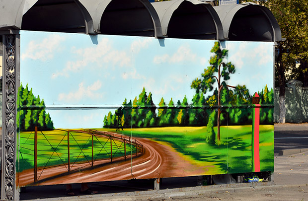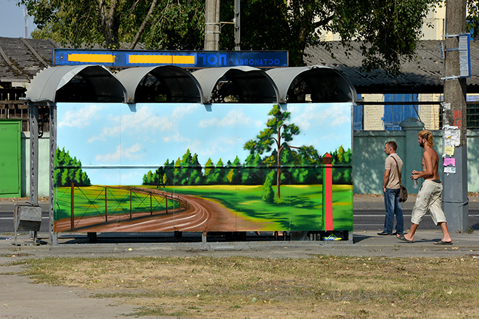 Просто покрасить старый облупившийся павильон — неинтересно. Так решили на офицерском собрании и объявили конкурс интересных идей. Кто-то предложил пригласить для росписи остановки профессионального граффитиста, что и было сделано.