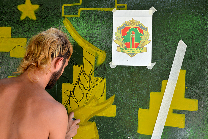 Всего за день павильон обрёл совершенно новый вид. Его задний фронтон украсило «полотно» с изображением типичного полесского участка Государственной границы. Все необходимые атрибуты на месте: пограничные столб и вышка, сигнализационный комплекс с контрольно-следовой полосой. Важно, что художник передал ощущение атмосферы, царящей в приграничье — мир и спокойствие.