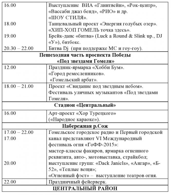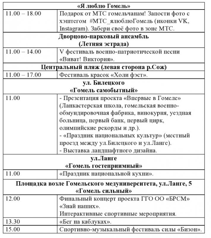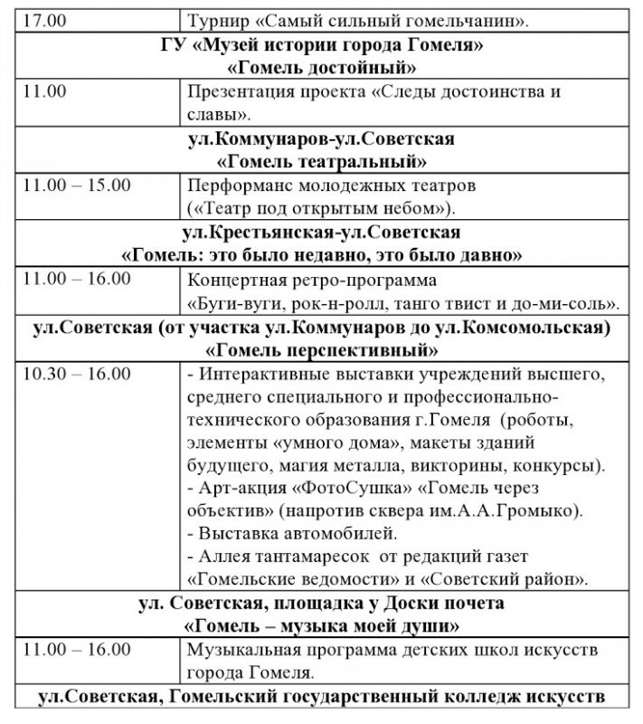 Программа праздничных мероприятий, посвященных Дню города Гомеля 12 сентября