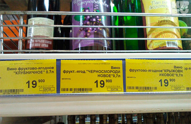 Подарок местным пьяницам устроил один из крупнейших гомельских гипермаркетов. В то время как в большинстве магазинов самое дешевое пойло — крепленые плодово-ягодные напитки — стоят в районе 40 тысяч рублей за бутылку 0,7 литра, в гипермаркете появились предложения по 19900 рублей. За такую цену здесь продают продукцию Толочинского консервного завода — фруктово-ягодные столовые полусладкие вина.