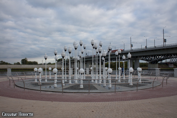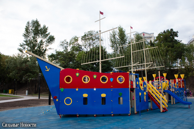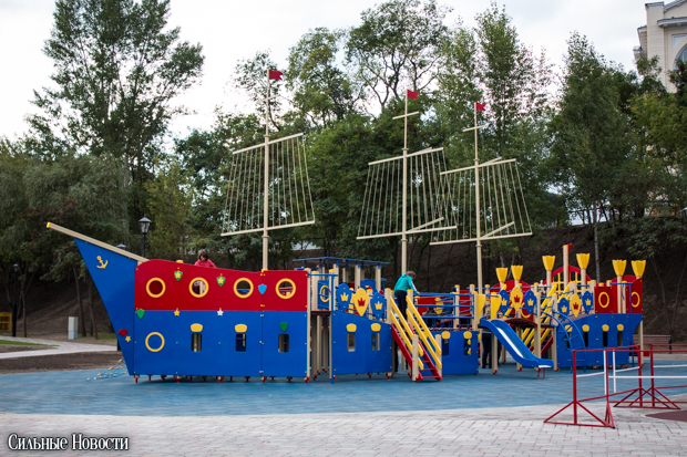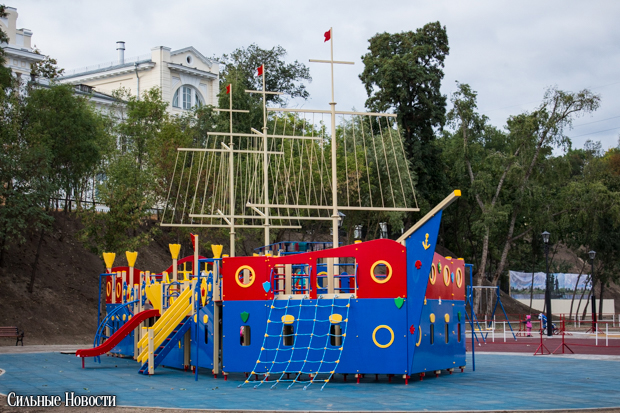 Кроме композиции из фонарей, на новой набережной разместилась детская игровая площадка в виде трёхмачтового парусника.