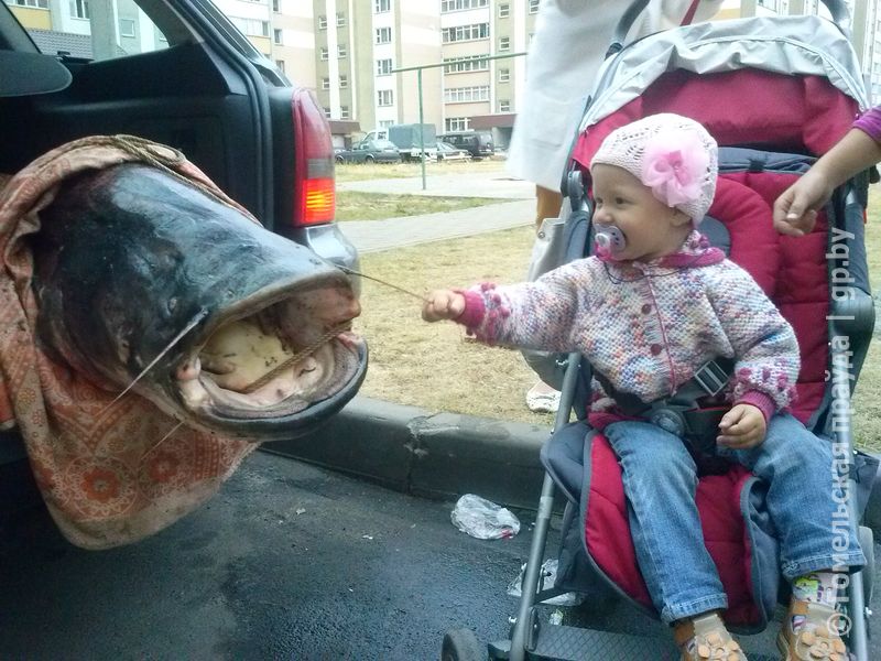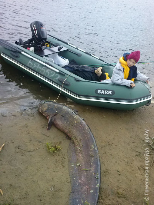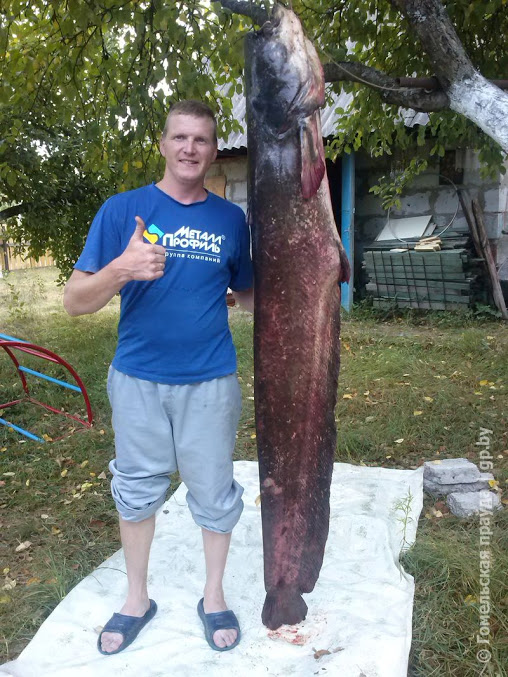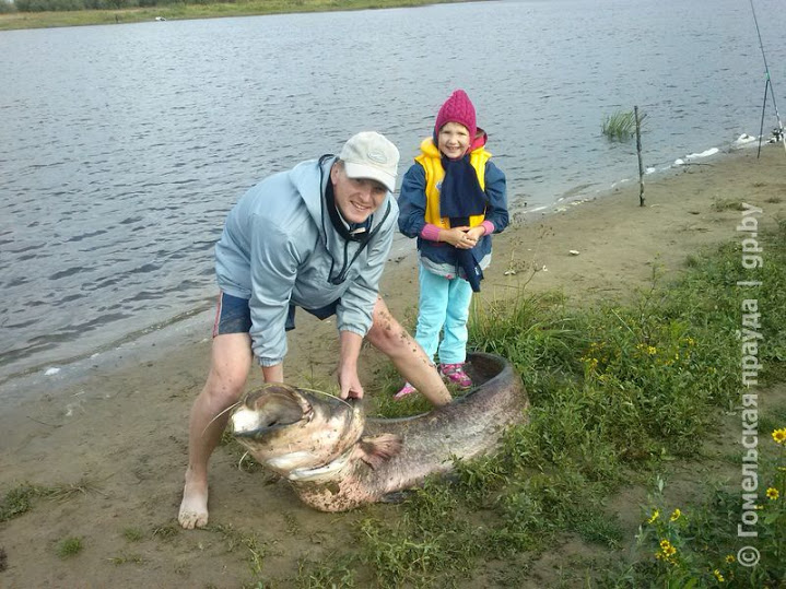 Дело было в начале сентября на Днепре, недалеко от моста под Речицей, у деревни Дворец. Рыбачить Сергей не планировал — дочка попросила покатать на лодке. Просто спиннинг под рукой оказался, воблер (приманка) тоже. Забросил и через короткое время... дернуло. Сразу понял: кто-то серьезный. С лодкой рыбина боролась долго, всплыла через 40 минут. Наверно, посмотреть: кто это такой дерзкий? Сергей увидел двухметрового сома весом в полцентнера — этакий «кашалот». Вытащить его помог стоявший на берегу незнакомый рыбак. Один бы не справился.