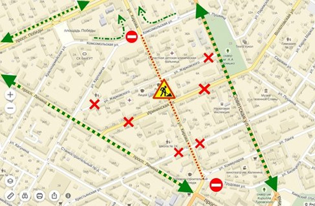 Транспортный поток направят по проспектам Ленина и Победы, и улице Советской. На время ремонта участка улицы Кирова транзитное движение по улицам Жарковского, Ирининской и Крестьянской будет невозможно, движение по улице Комсомольской перекрывать не станут.