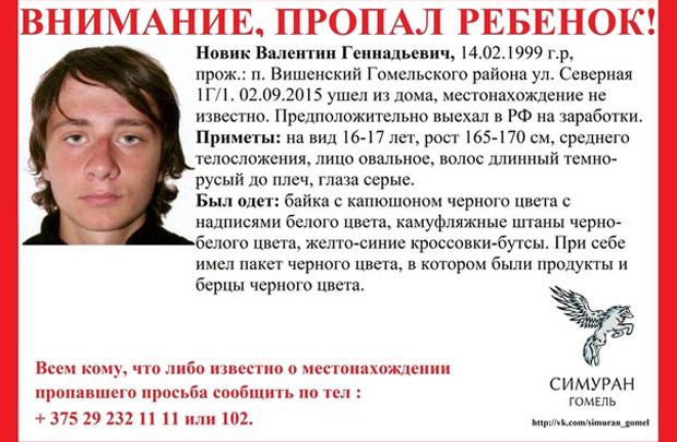 Валентин Новик родился 14 февраля 1999 года. Проживал в поселке Вишенский Гомельского района. На вид ему 16–17 лет, рост 165–170 см, телосложение среднее, лицо овальное, волосы темно-русые до плеч, глаза серые.