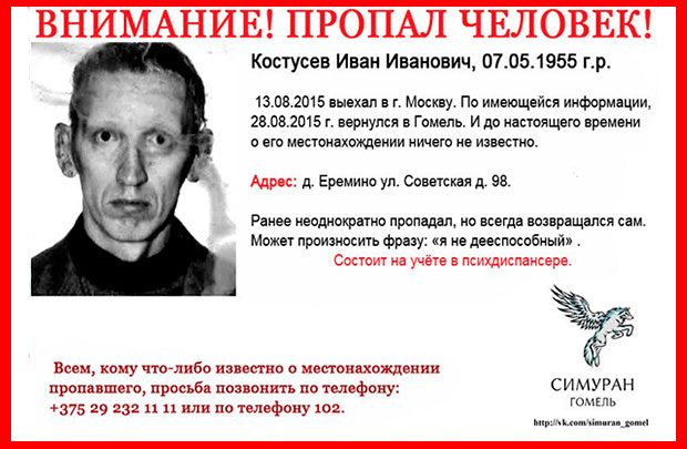 60-летний мужчина проживает по адресу: д. Еремино ул. Советская д. 98. Ранее неоднократно пропадал, но всегда возвращался к родным сам. Может произносить фразу «я не дееспособный». Состоит на учёте в психдиспансере.
