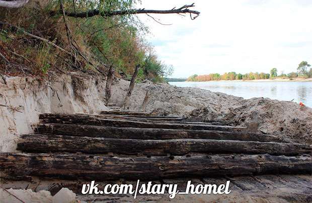 Откуда же тогда появилась легенда о мелководных участках и как они связаны с Гомелем? С начала 19 века активно развивалось судоходство по Сожу, и до строительства железной дороги именно река оставалась главной транспортной артерией, снабжавшей город различными товарами. В письменных источниках отмечается, что возле Гомеля действительно было множество мелководных участков. Один из них как раз располагался на южной окраине города между Новобелицей и урочищем Раковая Лоза. Именно здесь на берегу Сожа, который в этом году значительно обмелел, и были обнаружены остатки деревянного судна.