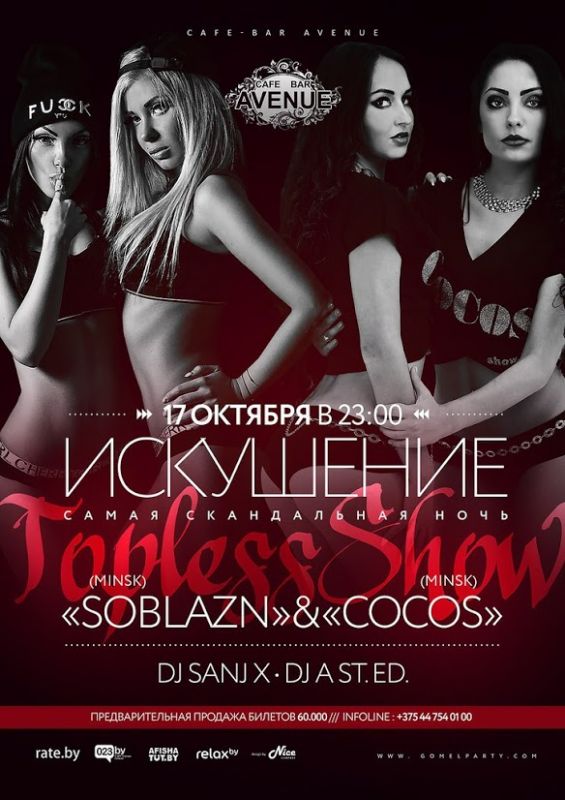 Будоражить ваше воображение будет самое смелое Topless Show двух дерзких дуэтов из Минска — «Soblazn» & «Cocos». Помимо очаровательных девушек, Ваш слух будут радовать гуру музыкальной индустрии DJ SANJ X и DJ A ST. ED. Это мероприятие, определённо, достойно Вашего внимания.