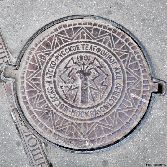 — Как оказалось, большевики вместе с предприятием национализировали и его логотип, образовав Народный комиссариат почт и телеграфов РСФСР. Таким образом, эта эмблема появилась на крышке люка, закрывающего телефонные коммуникации.