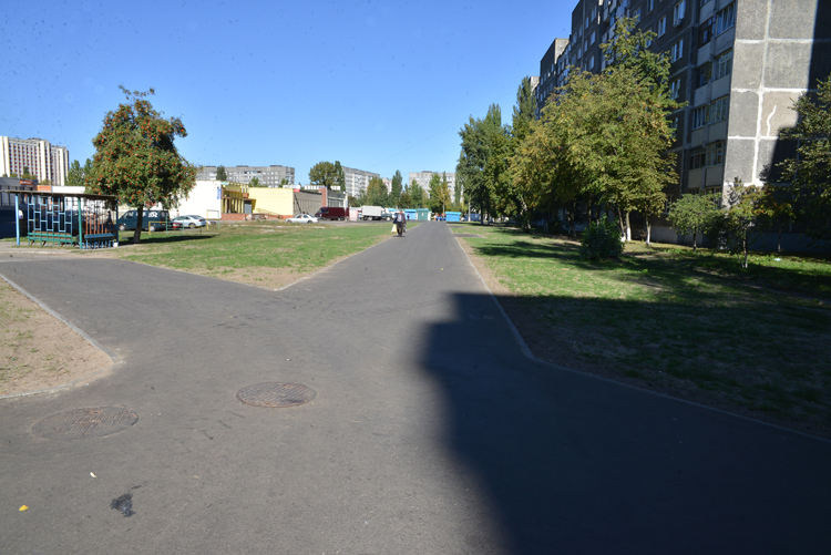 По другую сторону улицы продолжение той же магистральной трубы подарило нежданную радость целому кварталу. Жителям заасфальтировали широкую пешеходную дорожку в центр микрорайона, а в одном из дворов создали целую архитектурную композицию.