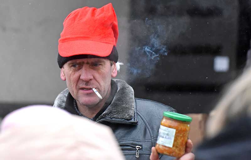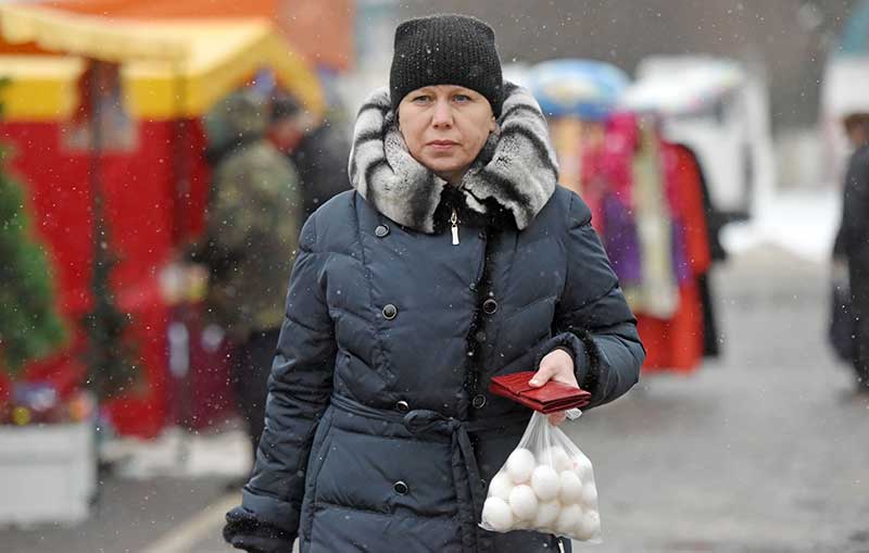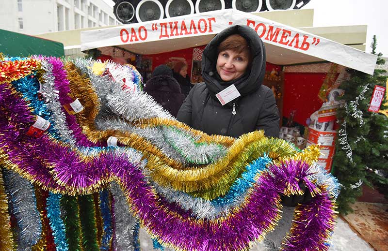 Но идут гомельчане на ярмарку не только за елями. Пришло время подумать о новогоднем столе. Судя по очередям у палаток птицефабрики, отказаться в год петуха от запечённой в духовке курицы и холодца готовы немногие. Женщины без конца спрашивали у продавцов, почему нет в продаже яиц. На что те им отвечали: на холоде, в открытой палатке, продавать запретили. Тем не менее яйца категории 1Д по 1 рубль 70 копеек на ярмарке найти удалось.