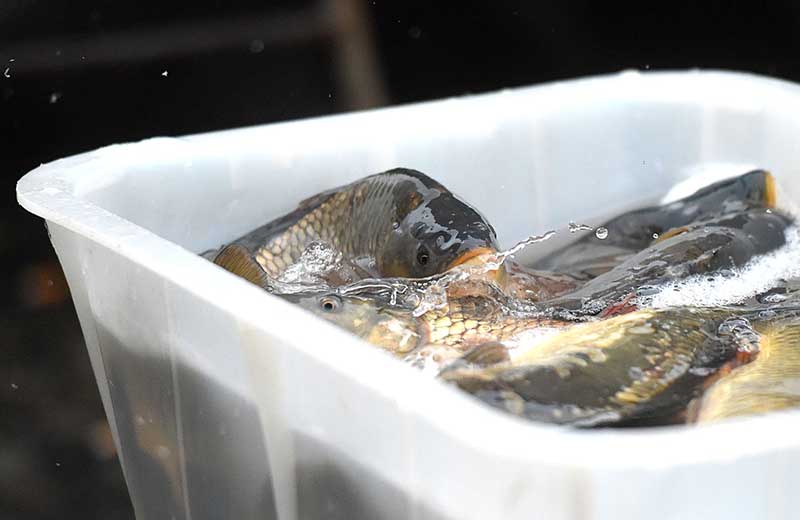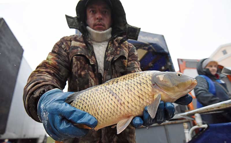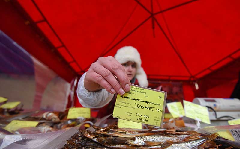 Кто-то всё же решил отказаться от "куриного" меню и сосредоточился на рыбе. Здесь её было вдоволь: живой, мороженой, компчёной, сушёной. Карп живой в зависимости от размера по 3 руб. 90 коп., 4 руб. 70 коп. и 5 руб. 16 коп. за килограмм. Амур — по 4 руб. 75 коп., щука средняя — по 5 руб. 70 коп.