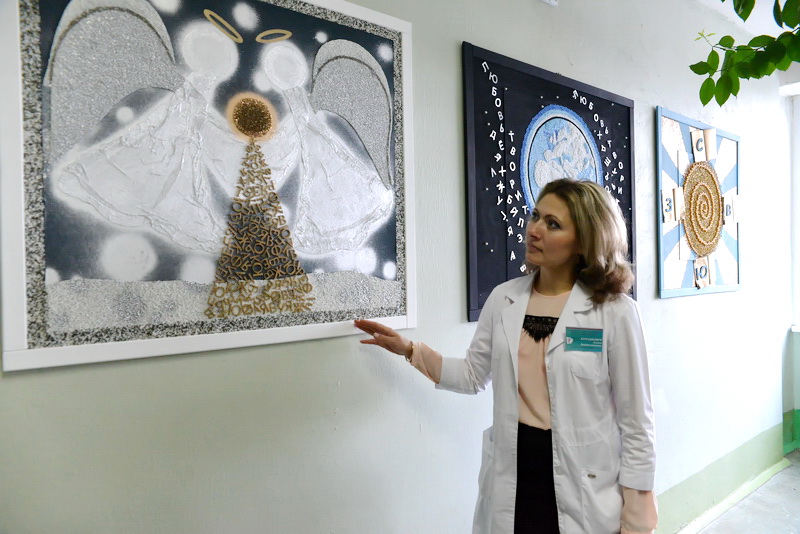 — Такой необычный подарок очень обрадовал. Сначала переживали, что посетители испортят картины. Но они висят с ноября и, как видите, в отличном состоянии. Место для них мы определили сразу. На этаже, где дети проходят восстановительное лечение. Картины помогают им отвлечься от болезни, что тоже очень важно. Мы ведь стараемся не только лечить, но и духовно обогащать. Хотим, чтобы нашим маленьким пациентам в стенах поликлиники было не страшно, а уютно, — рассказала заведующая Елена Курашевич (на фото вверху).
