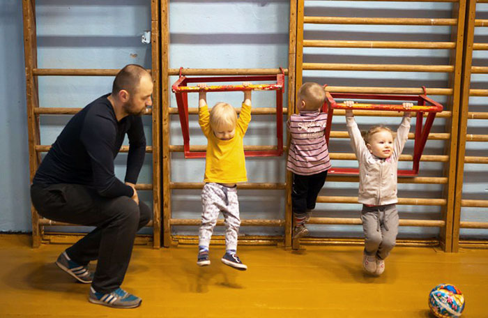 – Если говорить просто – это аналог песочницы, куда обычно приходят мамы с детьми. Малыши вместе играют, а мамы общаются между собой. То же происходит и в «ПапаЗале», только собираются вместе папы и дети. В спортзале есть маты, скамейки, шведские стенки. То есть можно полазить, попинать мяч. Основной возраст детей от полугода до пяти лет. Физическое развитие ребёнка в этом возрасте нужно осуществлять очень осторожно и в большей мере за счёт организации игрового пространства (под это идеально подходит спортивный зал) и наличия поддерживающего взрослого (папы). Поэтому занятия не регламентированы никакими упражнениями, мы просто играем вместе в то, что интересно детям, – раскрыл суть автор проекта и руководитель Совета отцов города Гомеля Сергей Бычков.