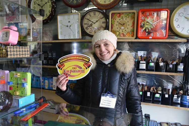 В промышленной части рынка наградили павильон «Часы» ЕЛЕНЫ МАЛЬЦЕВОЙ. Знак и сувенир от «Кирмаша» приняла продавец Светлана Саксонова, которая и заработала хозяйке добрую славу. Этот торговый объект готов обеспечить часами всех видов любую среднестатистическую городскую квартиру, помочь выбрать памятный подарок к празднику. Есть и сопутствующие товары.