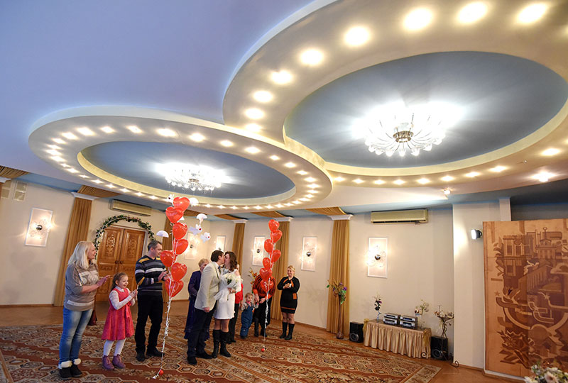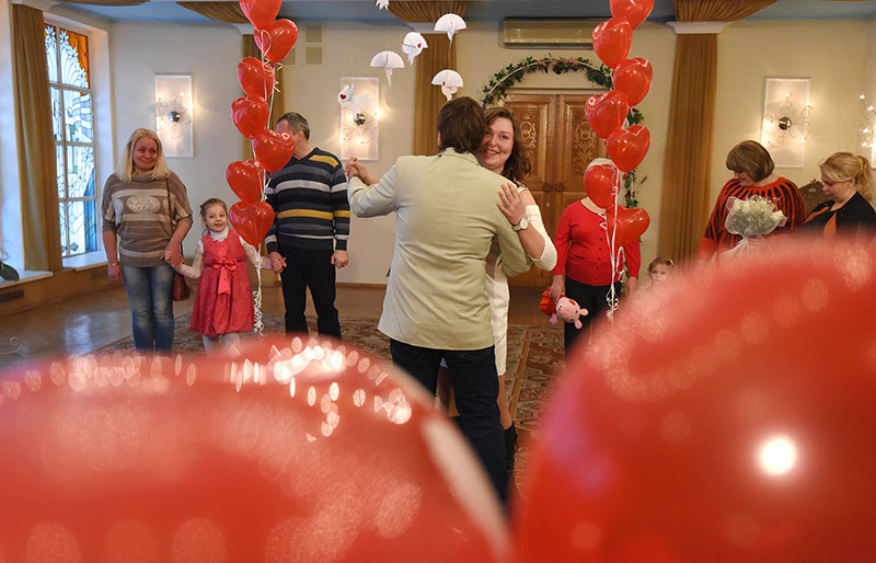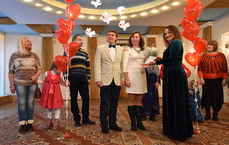 В День всех влюблённых в Советском загсе Гомеля зарегистрировали брак девять пар. В подарок от загса они получили бесплатно торжественную церемонию с воздушными шарами, валентинками и медленным танцем.