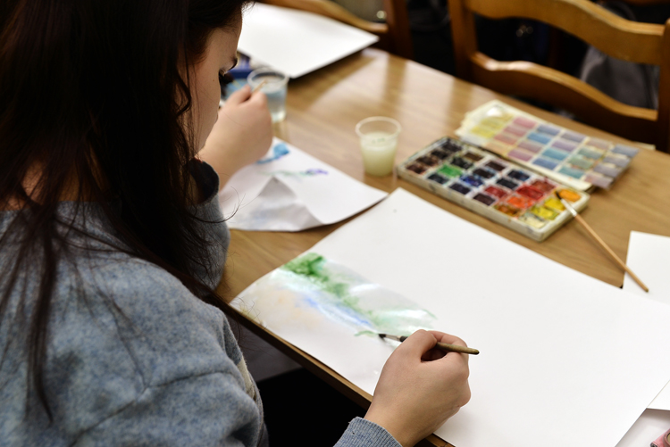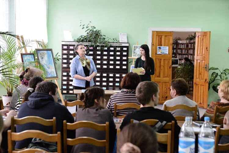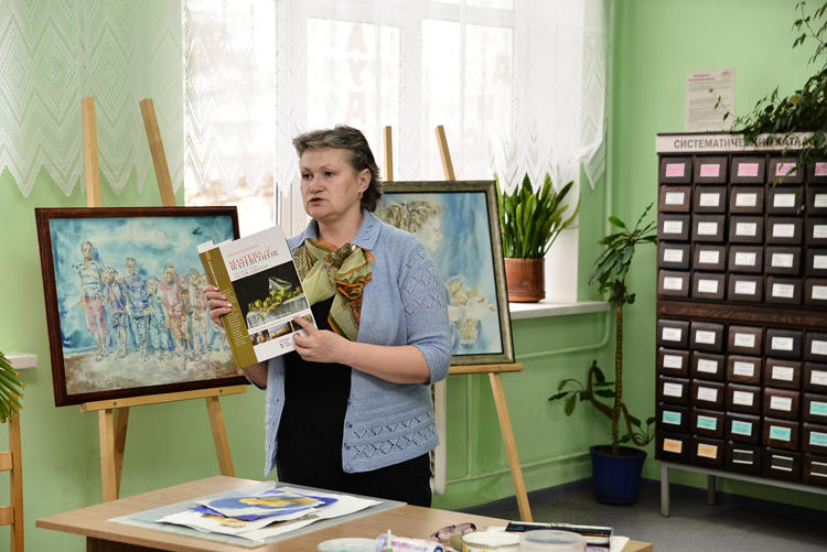Они пришли в библиотеку с бумагой, кисточками, красками и живо интересовались, где можно взять стаканчики с водой. Когда все заняли места, слово взяла молодая сотрудница библиотеки. Она привела краткую биографию Надежды Репиной (некоторые удивились, что Репина — это не псевдоним) и дала слово художнице.