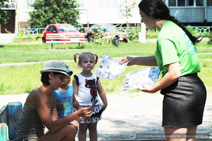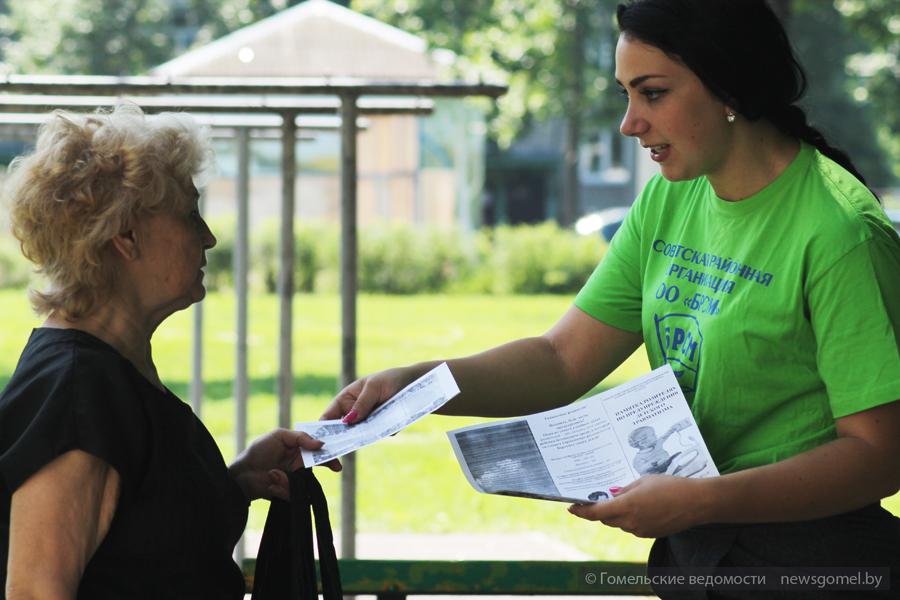 Пока участники смотровой комиссии готовились навестить жильцов дома, активисты Советской районной организации ОО БРСМ раздавали памятки родителям, которые присматривали за своими детьми, игравшими в песочнице. Получили информационные брошюрки и пожилые женщины, устроившиеся по соседству на скамейке.