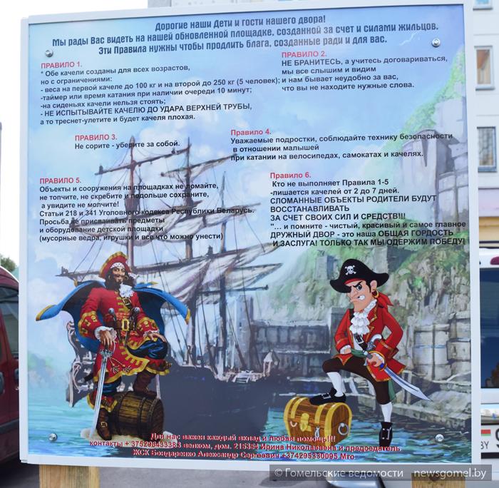 Раскрыла Ирина и секрет, как удаётся поддерживать порядок на территории. Ведь вечером здесь тьма ребятишек всех возрастов. Чтобы те могли без споров прокатиться на качелях, устанавливается очередь: покатался десять минут, уступи место другому. С целью предупредить хулиганские поступки повесили на площадке оригинальное и с юмором оформленное объявление. В нём разъясняется, что если ребята будут мусорить во дворе, их лишат на период от двух до семи дней права кататься на качелях. А если что-то специально сломают, их родителям придётся согласно действующему законодательству заплатить штраф (для убедительности приведены соответствующие статьи административного кодекса).