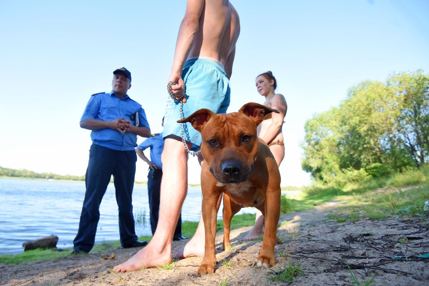 Милиционеры терпеливо ждут, пока молодой человек выговорится. Дают это сделать и его подруге, которая театрально возмущается, почему нельзя купаться там, где хочется. Наконец образуется короткая пауза, и на себя обращает внимание стаффордширский терьер. Хозяйский пёс на поводке, но без намордника.