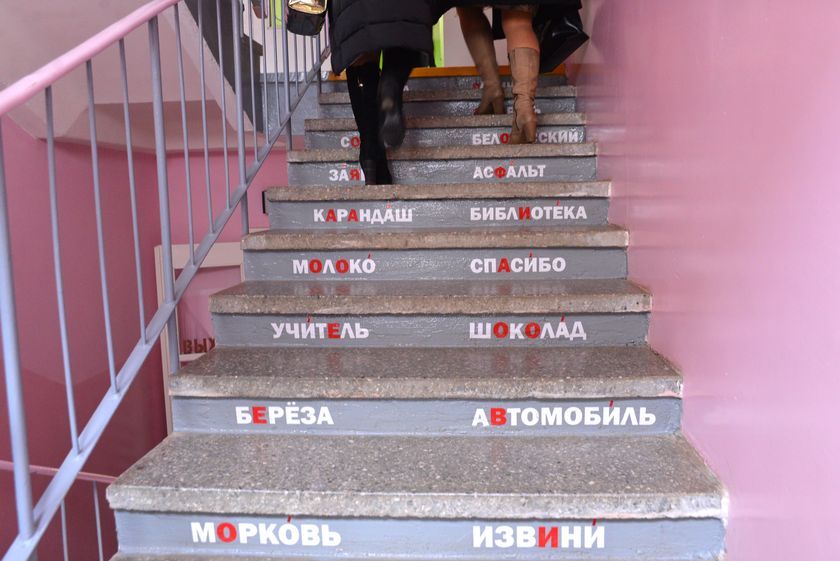 Удивило гостей и оформление пространства в школьных коридорах. На всех этажах краской нарисованы улитки, классики, дорожная разметка, а на ступеньках написаны словарные слова и таблица умножения.