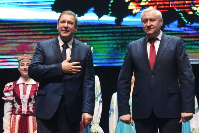 Владимир Дворник со сцены рассказал об экономических, социальных, культурных, спортивных и прочих достижениях Гомельщины.