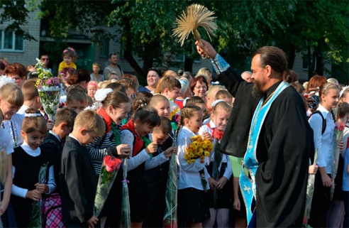 В Советском районе участников школьной линейки окропили святой водой