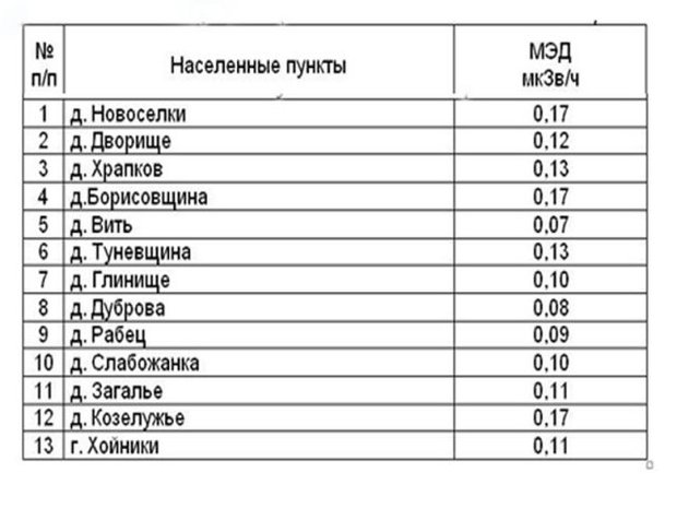 Радиационная обстановка в населенных пунктах Хойникского района (установившиеся многолетние значения — до 0,2 мкЗв/ч)