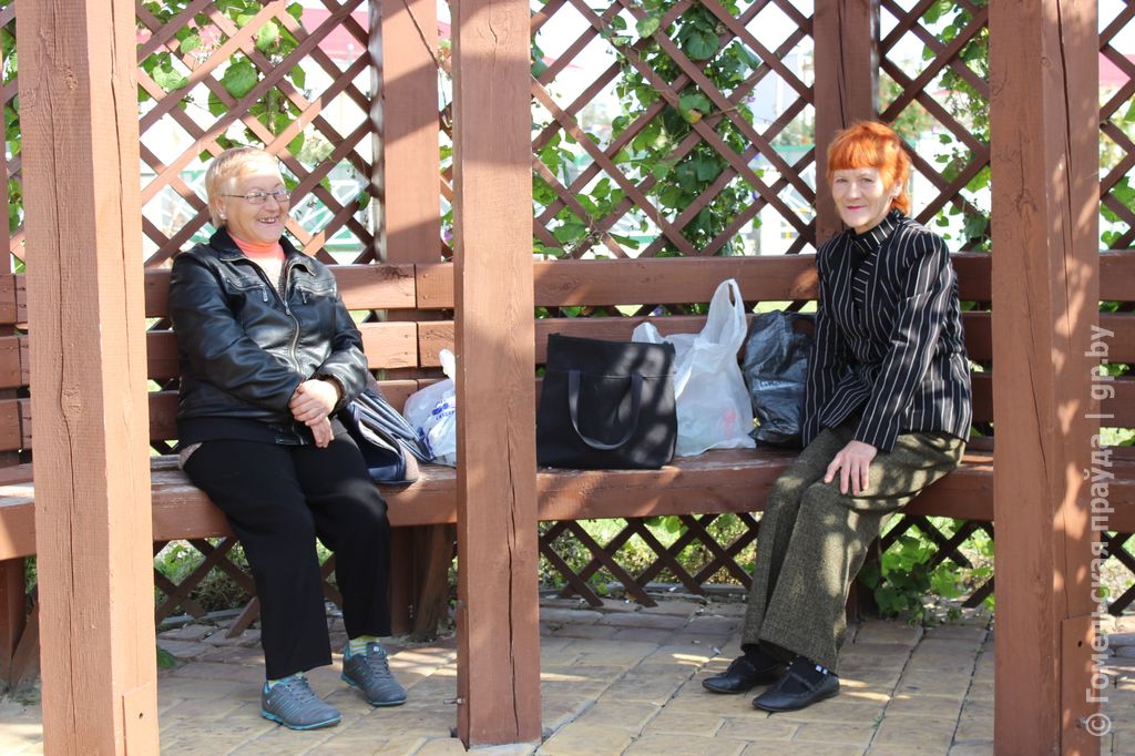 Пенсионерки наслаждаются последними теплыми деньками, сидя на лавочке в главном парке города