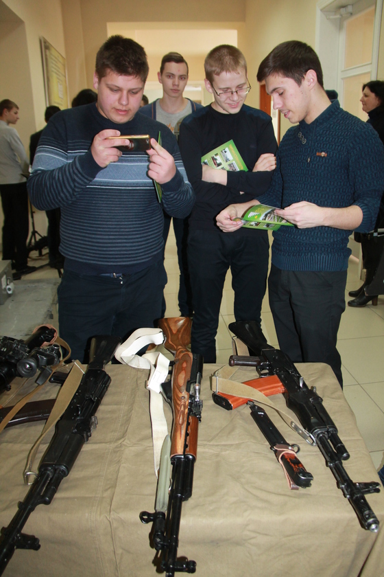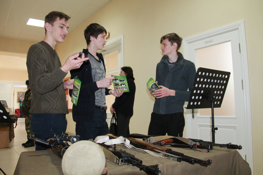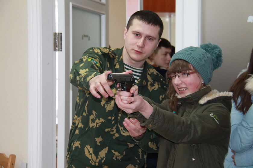 Свае экспанаты ўзбраення розных часоў прывезла Гомельская пагранічная група. Кулямёт Калашнікава, пісталет Шпагіна, вінтоўка Мосіна — усё гэта маглі ўбачыць і патрымаць у руках наведвальнікі музея. Для школьнікаў правёў экскурсію начальнік аддзела ідэалагічнай работы Гомельскай пагранічнай групы падпалкоўнік Андрэй Панасейка. Рабятам прапанавалі пастраляць з дапамогай спецыяльнага трэнажора, у якім не патрэбяцца кулі. Да мішэні праведзены правады, па якіх даныя пра стрэл перадаюцца ў праграму.