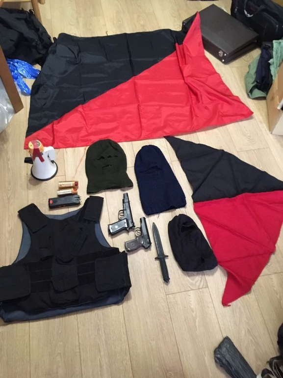 Кроме того, по месту ее жительства находились черно-красные флаг и бандана, три маски с прорезями для глаз, громкоговоритель и 20 брошюр, пропагандирующих анархизм. На вопросы о происхождении этих вещей девушка отвечать отказалась. По информации оперативников, она является активной участницей анархистского движения.