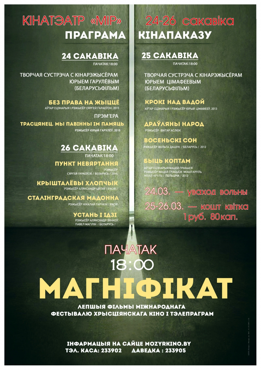 Зрители получили редкую возможность увидеть лучшие фильмы участников и призеров фестивалей прошлых лет. Международный фестиваль христианского кино «Магнификат» в Беларуси состоялся уже одиннадцать раз. В его программе обычно десятки документальных и мультипликационных фильмов. География «Магнификата» расширяется с каждым годом. Все участники его — профессионалы в области теле- и киноискусства. Это не просто международный фестиваль, это праздник кино, которое не нуждается в переводе.