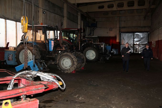 Еще одна группа под руководством заместителя начальника УВД Виталия Котченко посетила машинотракторный парк КСУП «Козенки-Агро». Представители управления проверили техническое состояние сельскохозяйственной техники, проведена сверка фактического наличия тракторов и комбайнов. В ряде случаев отсутствовали инвентарные номера. Кроме порядка с учетом техники необходимо провести субботник на рабочих местах в бытовых помещениях и складах. Так же, как и в хозяйстве Буда-Кошелевского района, есть вопросы по учету выезда и возвращения техники в рабочее время, а также по предрейсовому контролю физического состояния водителей.