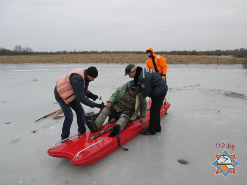В Петрикове спасателям пришлось около километра тянуть по льду пенсионера, сломавшего ногу на рыбалке (фото, видео)