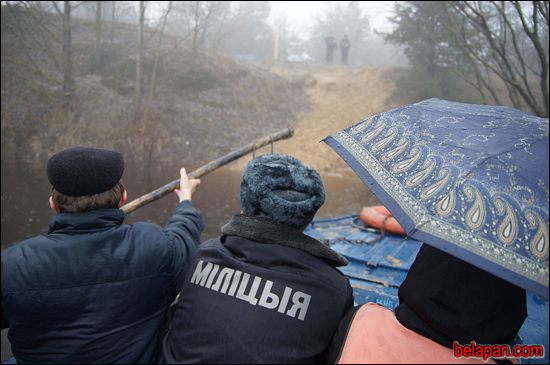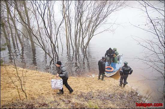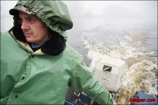 Плывём па рацэ, туман настолькі густы, што не відаць і дрэў за два метры. Выратавальнік майстэрскі кіруе маторкай, пятляе паміж кустоў беларускай Амазонкі. Праз 20 хвілін лодка прыстае да плоту, ля якога таксама ўжо плешчацца вада.