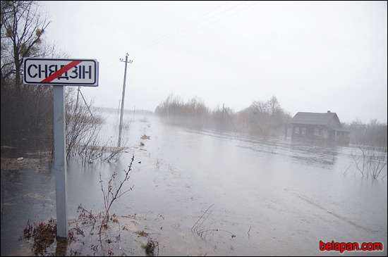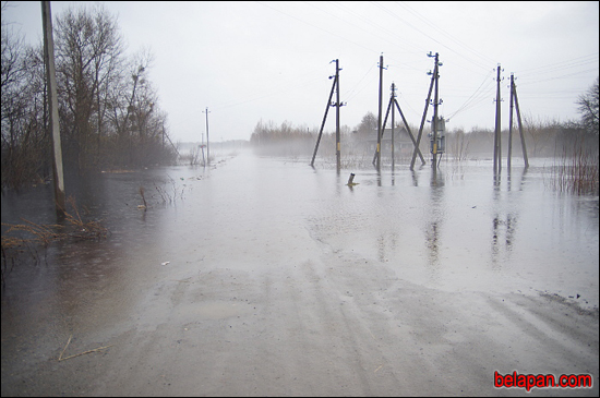 Падыходзім да пачатку вёскі, бачым размытую дарогу, якая рэзка хаваецца пад вадой. Дакладна тут не хутка нешта зможа праехаць, хіба на «амфібіі» выратавальнікаў, якая і будзе задзейнічана пры неабходнасці.