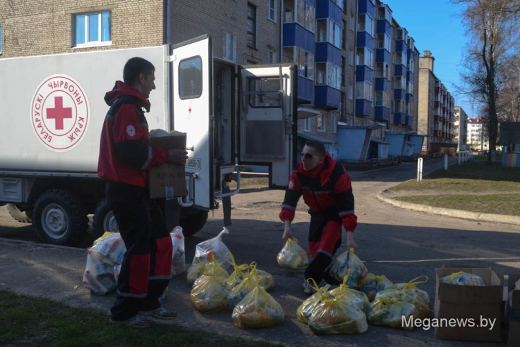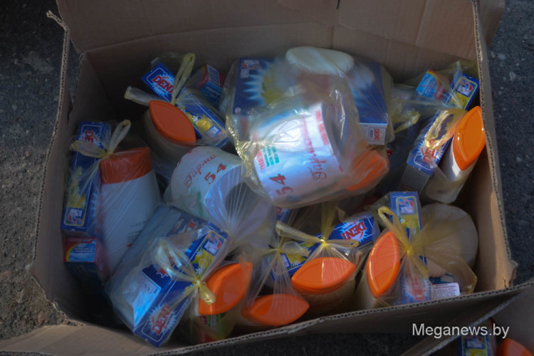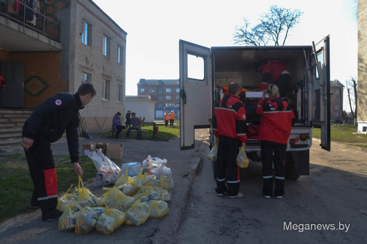 На причал в Петриков мы прибыли вместе с Красным крестом. Пока с воды дул холодный ветер, мы дружно по цепочке передавали в катер гуманитарную помощь в пакетах. Каждому жителю оторванной от цивилизации деревни полагалось два свертка. В одном хозтовары: мыло, порошок, шампунь, туалетная бумага; в другом продукты: мука, крупы, сгущенка, подсолнечное масло и питьевая вода.