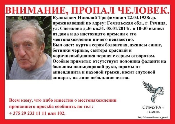Кулакевич Николай Трофимович вышел из своего дома на улице Снежкова, 36/31 в Речице 5 января, и его местонахождение до сих пор не установлено. Мужчина был одет в серую болоньевую куртку, черные ботинки, синие джинсы, коричневый и красный свитера, черную шапку с серым отворотом. Пропавшего легко узнать по отсутствию половины фаланги на большом пальце правой руки, шрамам на животе от паховой грыжи и вырезанного аппендицита, на лице присутствуют пигментные пятна, носит аппарат для плохо слышащих.