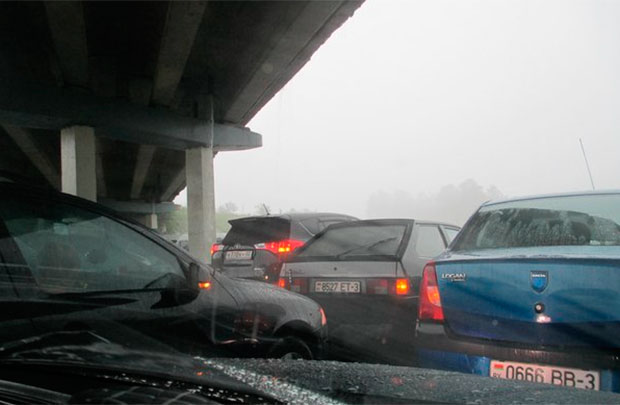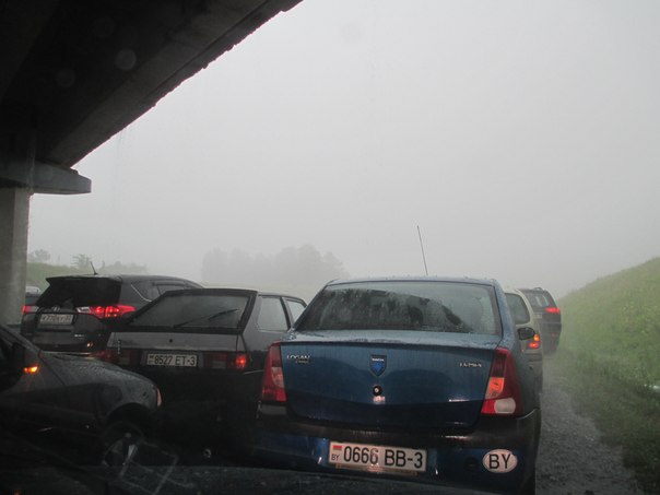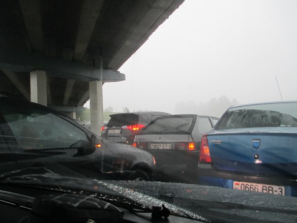 Вчера около 19:00 под Гомелем прошел дождь, который сопровождался сильным градом. По словам очевидцев, градины были размером с вишню. Водители, которым было жалко своих авто, пытались спрятаться под мостом, однако всем машинам, которые ехали в этот момент по оживленной трассе, естественно, места не хватило.