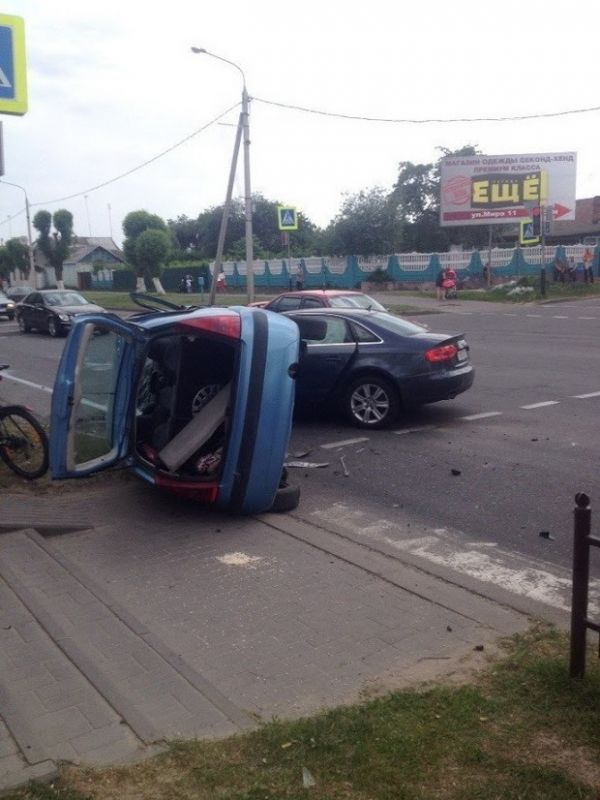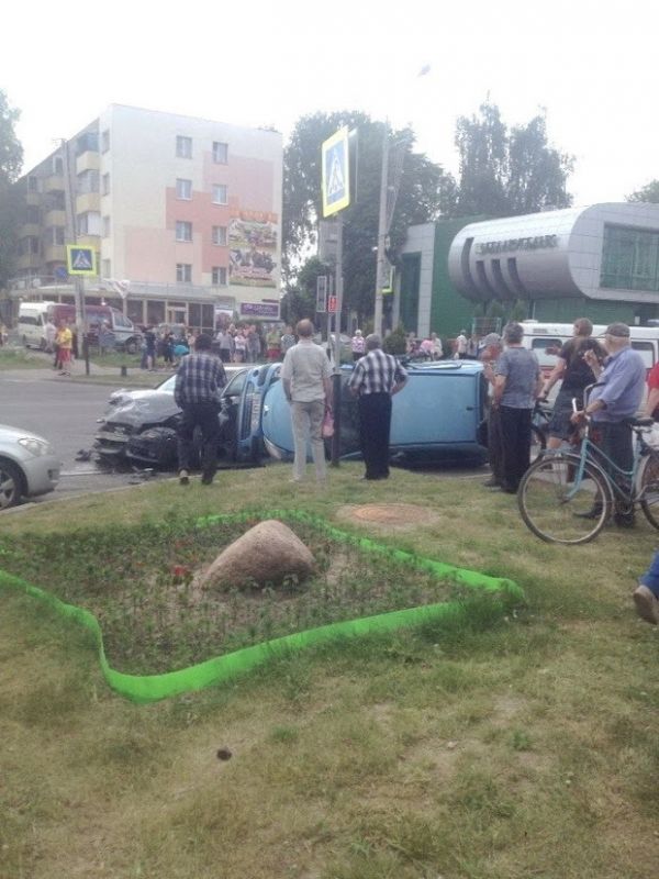 В Речице попытка водителя повернуть налево привела к тому, что оказались разбиты два автомобиля. Один из них от удара опрокинулся на бок.