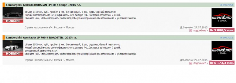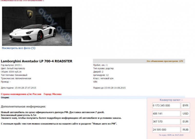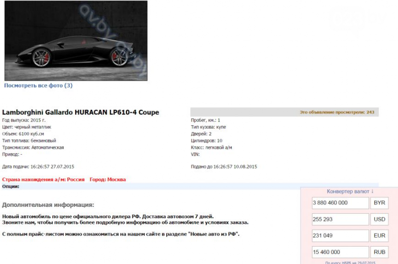 На сайте av.by размещено всего два объявления о продаже суперкаров: Lamborghini Gallardo HURACAN LP610-4 Coupe за 255 тысяч долларов и Lamborghini Aventador LP 700-4 ROADSTER стоимостью в 406 тысяч «зеленых».