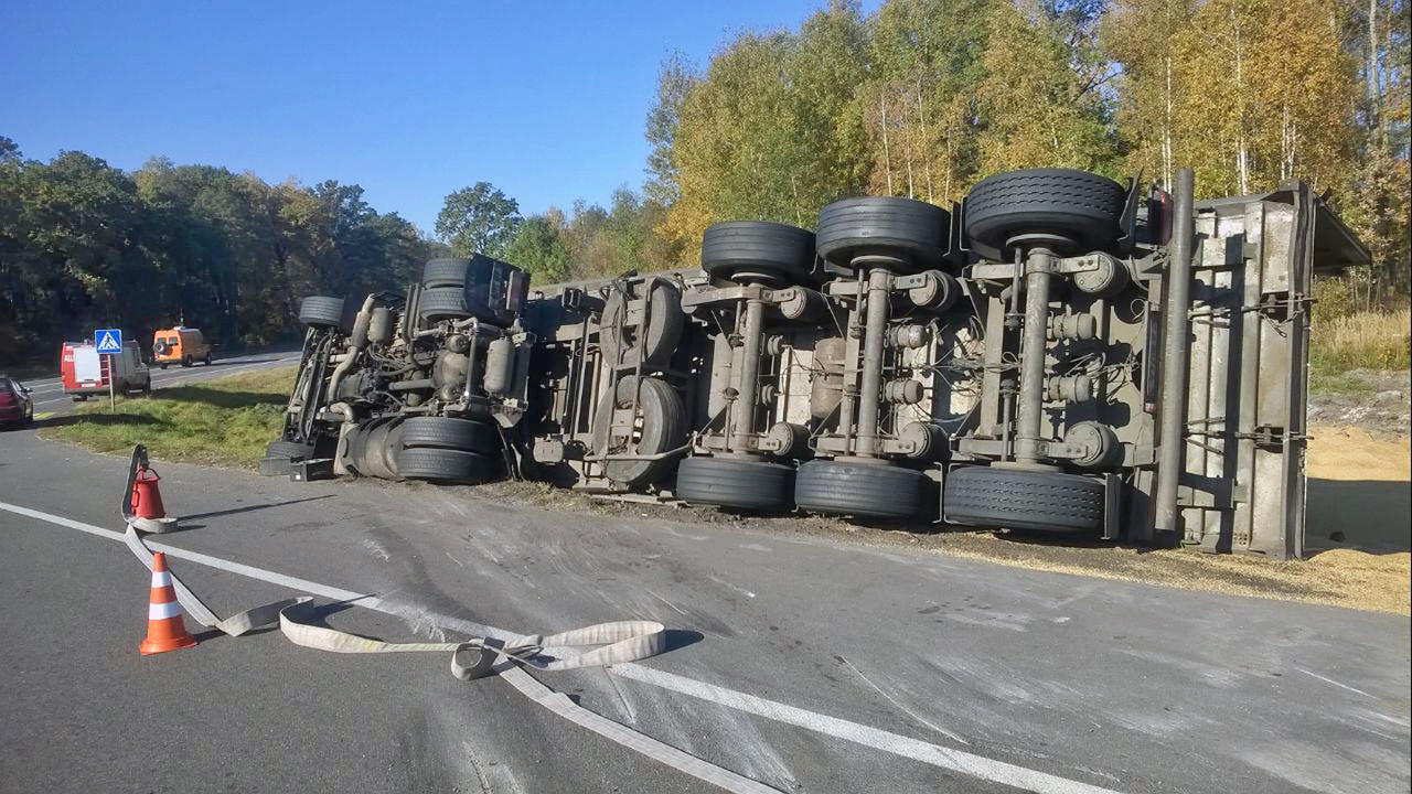 Около 10 часов утра на «Хойникском перекрестке» перевернулся большегруз с 24 тоннами зерна.