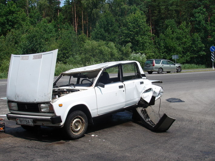 Около полудня на Речицкой трассе под Гомелем «Рено Лагуна» «догнал» «Жигули» со значком «У». Удар пришелся под таким углом, что учебный автомобиль принялся кувыркаться, а инструктора выбросило на дорогу. Очевидцем стал читатель Onliner.by OXAXI. Он же опубликовал на форуме первые снимки последствий.