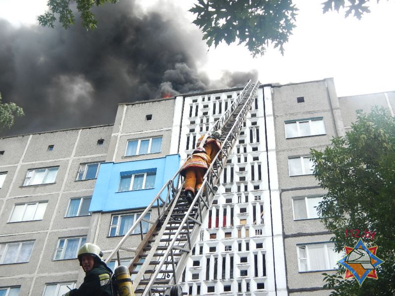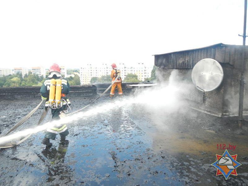 Днем 14 июля в речицкой многоэтажке на улице Наумова по неустановленным причинам загорелась крыша.